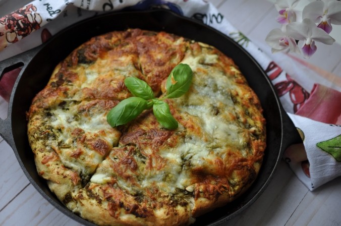 Preheat the oven to 400 degrees Fahrenheit. Now use fingers to stretch the dough out to a round shape. Carefully spread basil sauce and mozzarella cheese on top of the dough. Bake until golden brown, for about 20 to 25 minutes. While the focaccia bread bakes, brush melted butter on top. Serve warm.