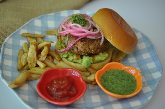 A spicy salmon burger with extra herbs is the perfect food for a relaxed weekend brunch. When preparing my salmon burger recipe, I included as ingredients pickled onions, avocado, and cilantro chutney (a very popular chutney in Pakistan). I use this chutney with various other dishes as well – it tastes ethereal.